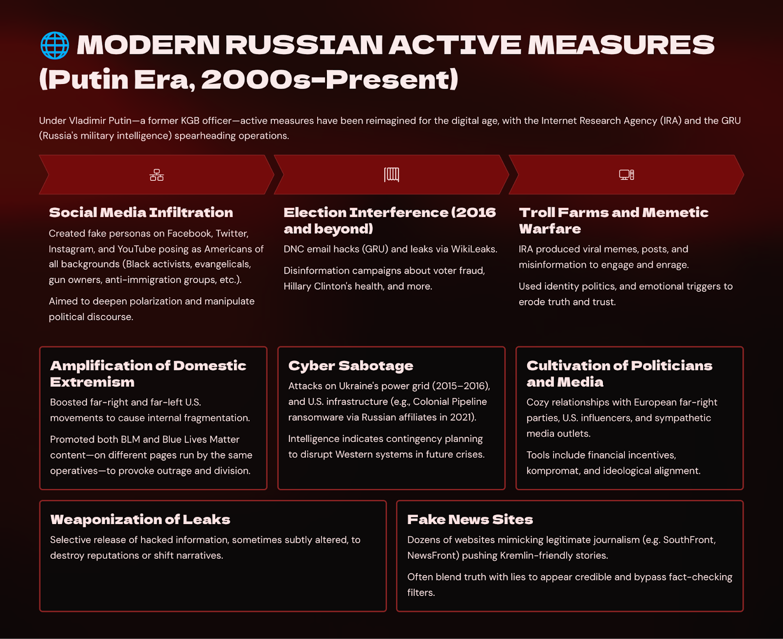 The collapse of the Soviet Union did not mark the end of active measures—as many in the West naively assumed—but rather their quiet transformation. Once Putin consolidated power, he began executing a long-simmering revenge campaign against the West, reviving Russia’s imperial ambitions through asymmetric means—most notably, by turning democratic elections into battlefields. Shaped by his KGB training and driven by a revanchist vision to restore Russian imperial influence, Putin understood that the internet is a borderless, real-time, and anonymous battlespace where the instruments of ideological subversion could be unleashed at unprecedented scale—veiled in plausible deniability, amplified by algorithmic reach, and executed at a fraction of the cost of traditional military confrontation.