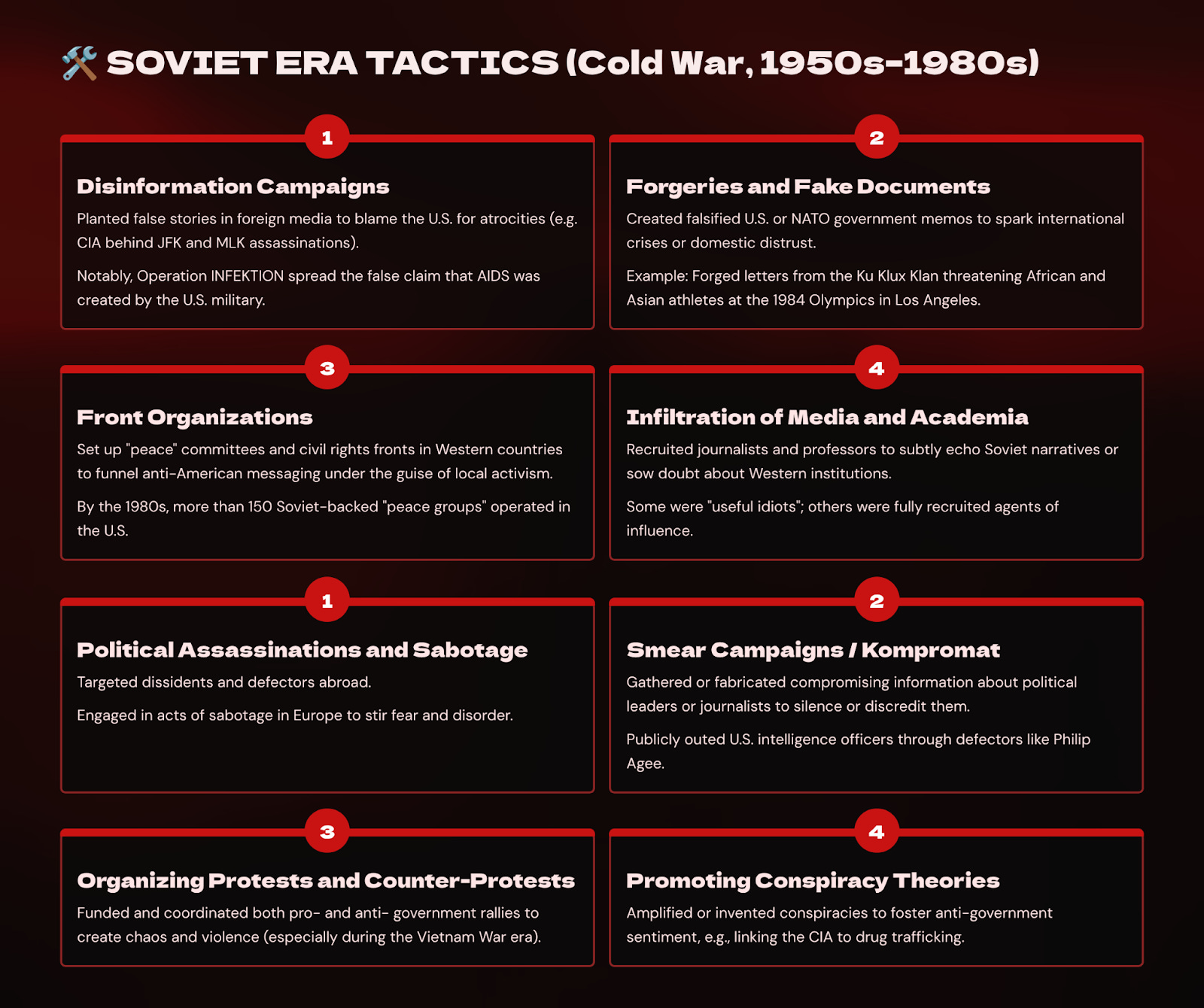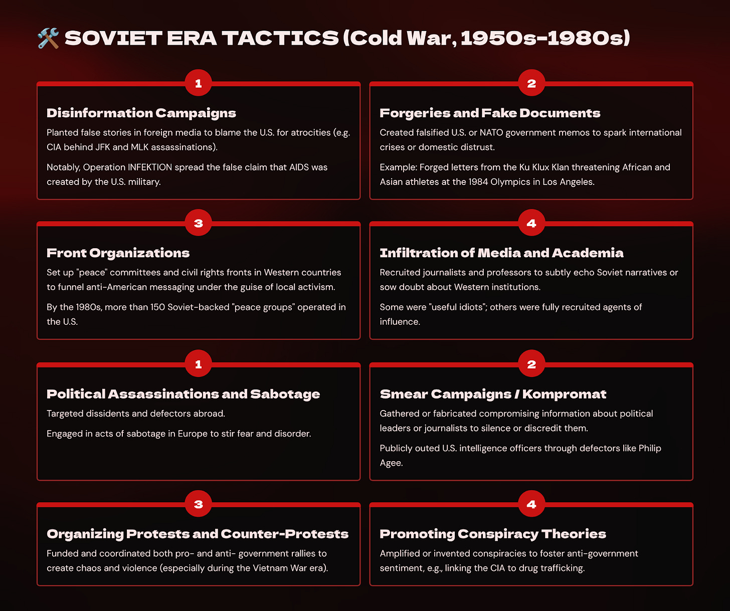 During the Cold War, the Soviet Union developed a comprehensive doctrine of psychological and political warfare known as aktivnye meropriyatiya, or “active measures.” These were not conventional espionage operations focused on collecting intelligence. They were strategic campaigns of deception and disruption, designed to disorient adversaries, inflame internal divisions, and corrode public trust in democratic institutions. Occasionally, they involved targeted assassinations.