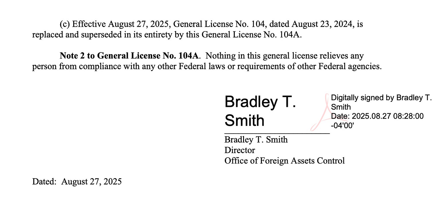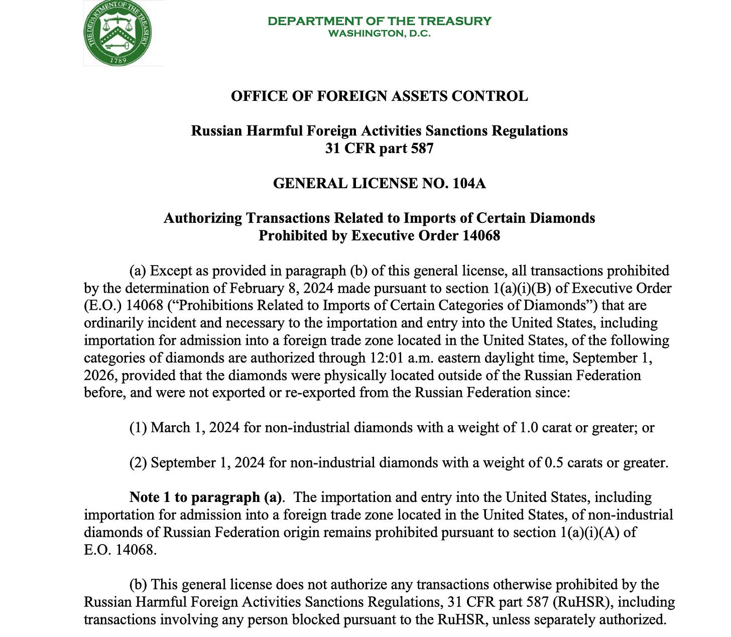 And eggs are just the beginning. In the same Russian article on eggs was another piece from last week about the U.S. Treasury issuing waivers on Russian diamonds. So I checked that out too. Sure enough, just days before those egg shipments showed up in a U.S. trade report, the Treasury Department quietly issued a new general license for Russian diamonds. The sanctions imposed in 2024 had banned them outright, cutting off one of Russia’s most profitable export streams, but as of September 1, the ban has been softened with carve-outs and grandfather clauses.