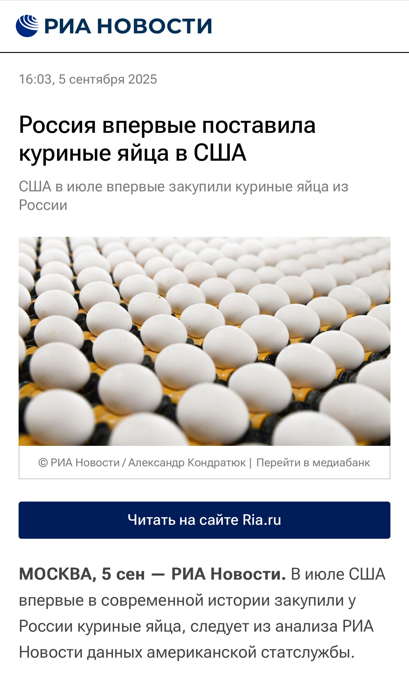 I was reading Russian media and stumbled on an article in RIA Novosti bragging that the United States had just imported eggs from Russia for the first time in over thirty years. My initial reaction was that it had to be propaganda — Moscow loves to capitalize on any opportunity that appears to be a crack in Western sanctions. But when I looked into it, it turned out to be true. What struck me even more was that when I checked U.S. media to see how it was being covered, I couldn’t find a single report on it.